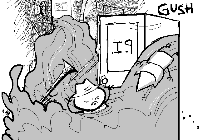 Water from the flooded room spills into the hall, dousing the flames.