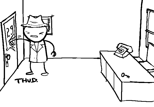 You don't know why you are assuming the door will be locked. You don't usually keep the door to your office locked. Nonetheless, a guy this hard boiled doesn't go messing around with totally unmanly things like knobs.
