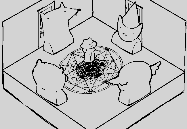 On the four walls of the room are large stone busts. Each appears to be blocking a doorway.