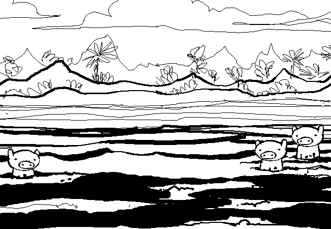 You land in a mysterious realm. A small band of hogs is there to greet you in the hospitable comfort of a muddy wallow.