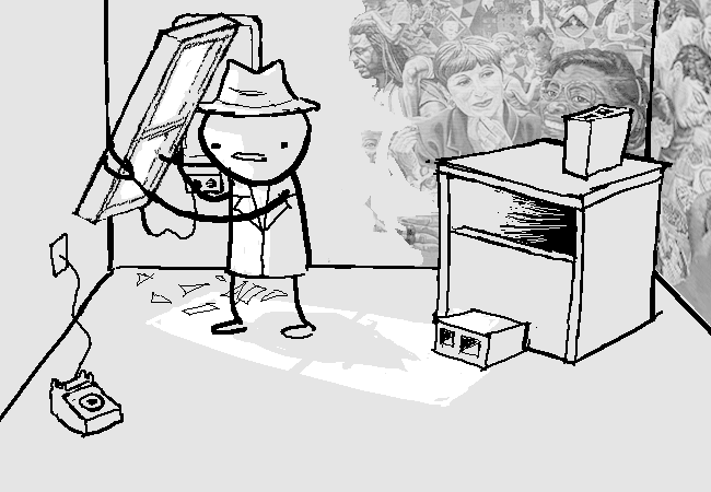 The window comes off the wall altogether. On closer examination, it seems to be a false window with a picture inside it. The picture is lit from within, sort of like a sophisticated light box.