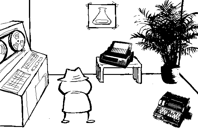 There is a computer station along with a DOT MATRIX PRINTER and a PUNCH CARD MACHINE, which is on the floor for some reason.