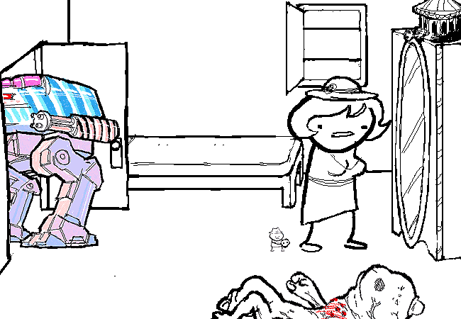 The candy mecha walks out the door for some reason.