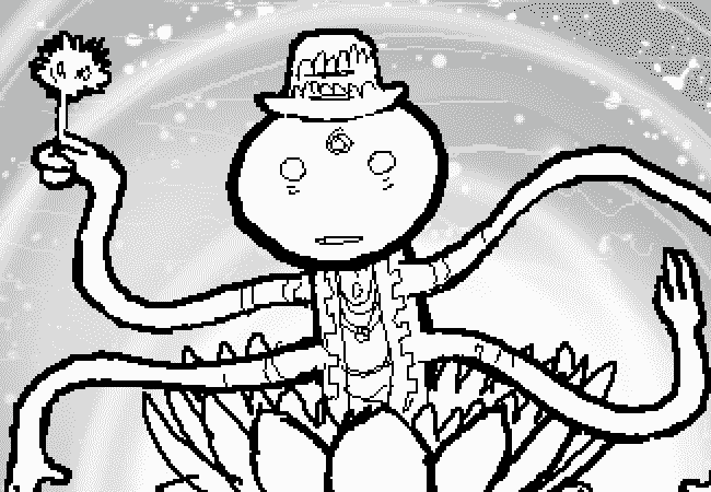 Also, a while ago AD used a game code to restore an earlier state in the game. That earlier version of AD went through the storefront and out the music box and became small AD. Meanwhile, the present AD went about his business in the present.