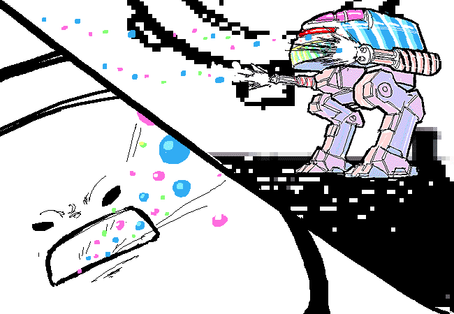The small mecha releases a confectionary barrage.
