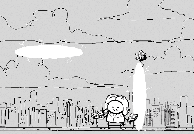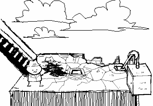 The mecha lands hard on the street, causing major damage to surrounding buildings.