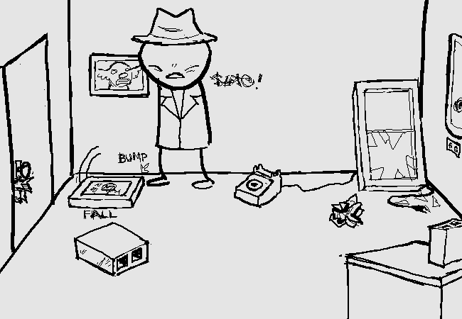 You shout, but he cannot hear you. The walls may be too thick, or he is just engrossed in his conversation. It sounds like he is arguing over a misunderstanding about the nature of the services provided by Busts-R-Us, and an alarmingly large bill for those services.