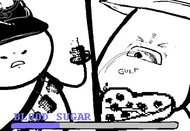 You lob a HAND GRENADE into MK's mouth. His BLOOD SUGAR level rises again. Now is the ideal time to attack!