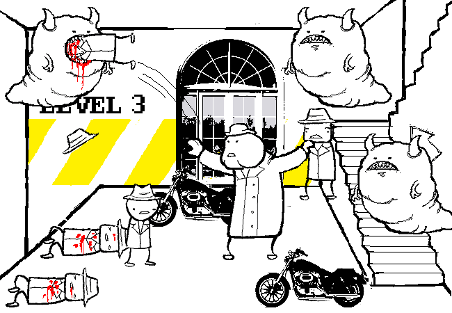 ADs: Bust through doors.