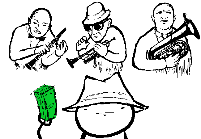 You levy the fee of 3000 SPONDULICKS and summon a trifecta of mystical warriors, the great masters of brass, Buttermilk Stubbs, Ramblin' Jackson, and Molasses Fatts!