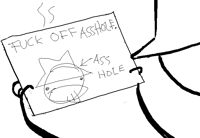 It appears to be a note delivered to you from Ace Dick. It smells a little like pee. You hate him so much.