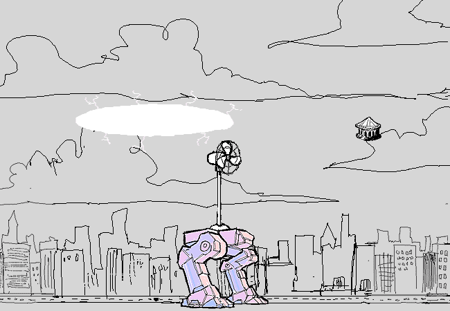 Below, the candy mecha's legs scramble around like a chicken whose head decapitated itself and flew into the sky to fight a demonic mob boss.