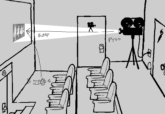 The gutterpipe projects you through the MOTION PICTURE PROJECTOR, which is currently showing a BURLESQUE FLAPPER ACT in an empty theater.