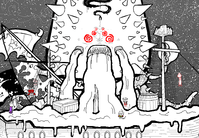 DMK pukes a deluge of PIE FILLING. The deck is a gooey mess. It's disgusting.