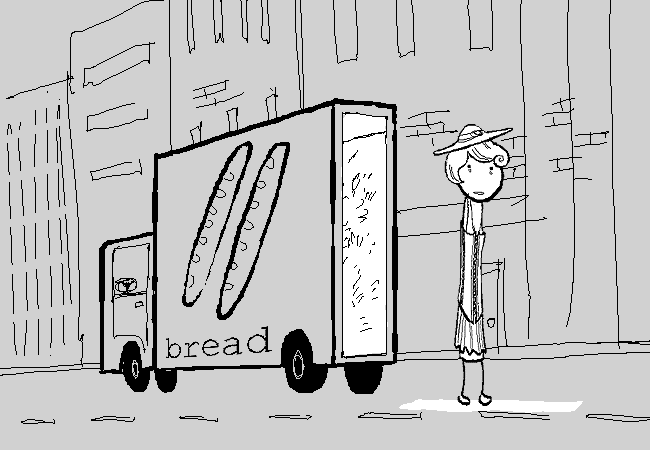 You exit the rear cabin of the BREAD TRUCK.